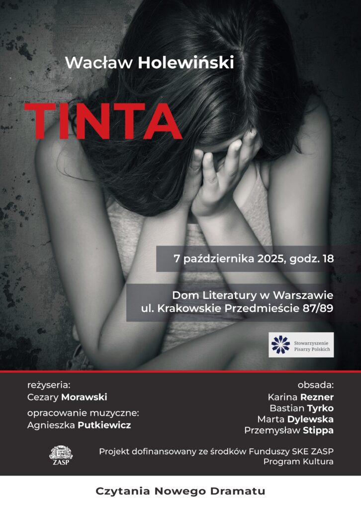 Stowarzyszenie Pisarzy Polskich i Dom Literatury zapraszają we wtorek, 7 października br. o godz. 18.00 na prezentację dramatu Wacława Holewińskiego „Tinta” w reżyserii Cezarego Morawskiego.