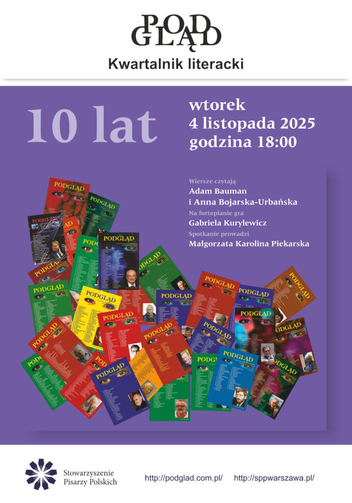Stowarzyszenie Pisarzy Polskich i Dom Literatury zapraszają we wtorek, 4 listopada br. o godz. 18.00 na obchody jubileuszu dziesięciolecia Kwartalnika Literackiego „PODGLĄD” wydawanego przez Oddział Warszawski Stowarzyszenia Pisarzy Polskich.