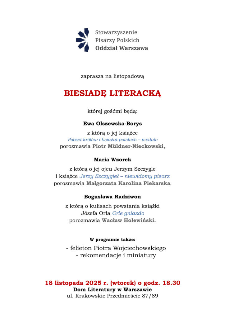 Stowarzyszenie Pisarzy Polskich Oddział Warszawa i Dom Literatury zapraszają na kolejną odsłonę Biesiady Literackiej, która odbędzie się 18 listopada br. (wtorek) o godz. 18.30 w Domu Literatury.