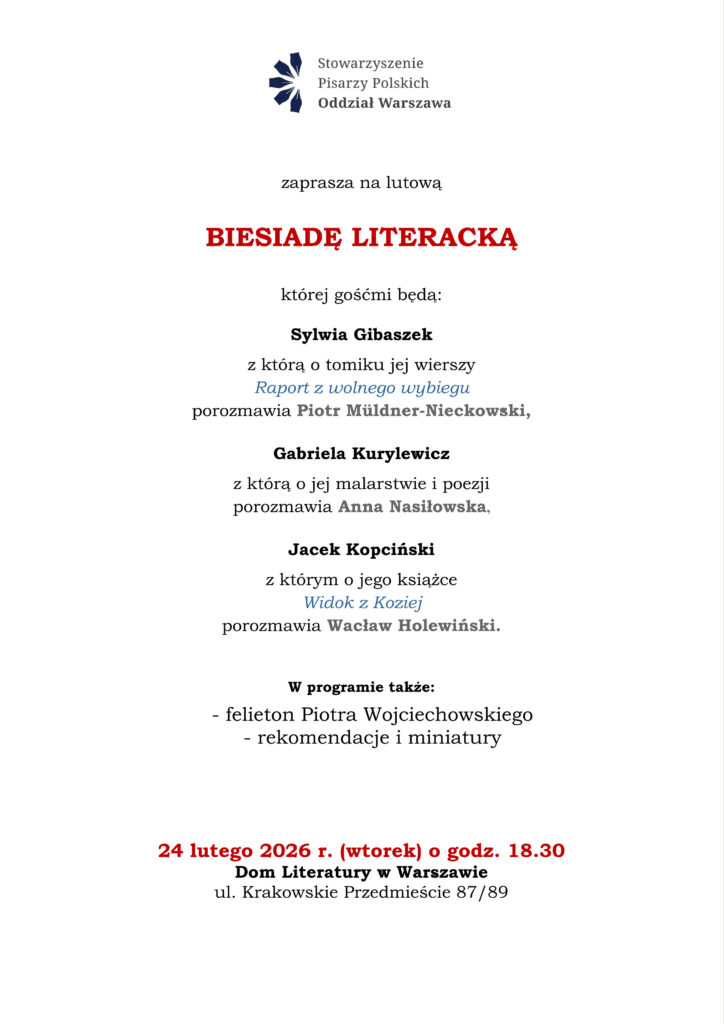 Stowarzyszenie Pisarzy Polskich Oddział Warszawa i Dom Literatury w Warszawie zapraszają na lutową Biesiadę Literacką. Spotkanie odbędzie się 24 lutego 2026 r. (wtorek) o godz. 18.30 w Dom Literatury.