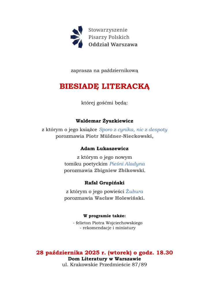 Stowarzyszenie Pisarzy Polskich Oddział Warszawa i Dom Literatury zapraszają na kolejną odsłonę Biesiady Literackiej, która odbędzie się 28 października 2025 roku (wtorek) o godz. 18.30 w Domu Literatury.