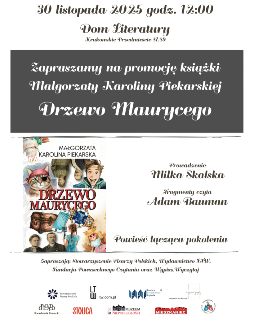 Stowarzyszenie Pisarzy Polskich, Wydawnictwo LTW, Fundacja Powszechnego Czytania, kampania Społeczna Wypisz/Wyczytaj oraz Dom Literatury zapraszają na promocję najnowszej książki Małgorzaty Karoliny Piekarskiej pt. „Drzewo Maurycego”. Spotkanie poprowadzi Miłka Skalska, a fragmenty przeczyta Adam Bauman. Zapraszamy 30 listopada o godzinie 12:00 do Domu Literatury.