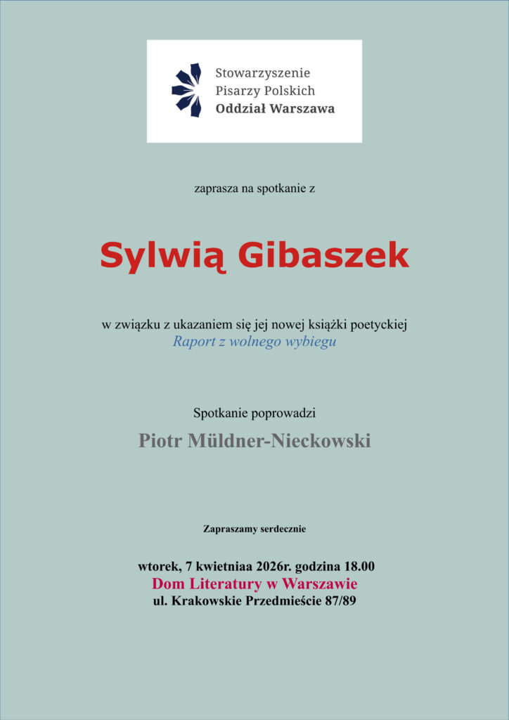 We wtorek, 7 kwietnia br. roku o godz. 18:00 Stowarzyszenie Pisarzy Polskich Oddział Warszawa i Dom Literatury w Warszawie zapraszają na spotkanie autorskie z Sylwią Gibaszek, zorganizowane w związku z premierą jej najnowszej książki poetyckiej „Raport z wolnego wybiegu”.