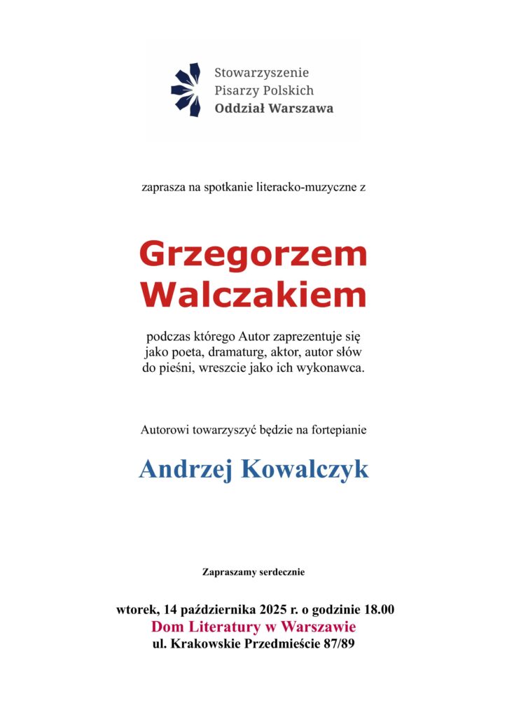 Stowarzyszenie Pisarzy Polskich Oddział Warszawa, zaprasza na wyjątkowe spotkanie literacko-muzyczne z Grzegorzem Walczakiem. Autor zaprezentuje się jako poeta, dramaturg, aktor oraz twórca słów do pieśni, a także ich wykonawca. Spotkanie odbędzie się we wtorek, 14 października 2025 br. o godzinie 18:00 w Domu Literatury.